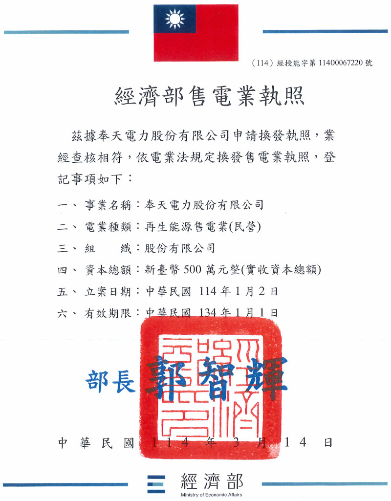 奉天電力於 114 年 1 月 2 日正式取得售電業執照。